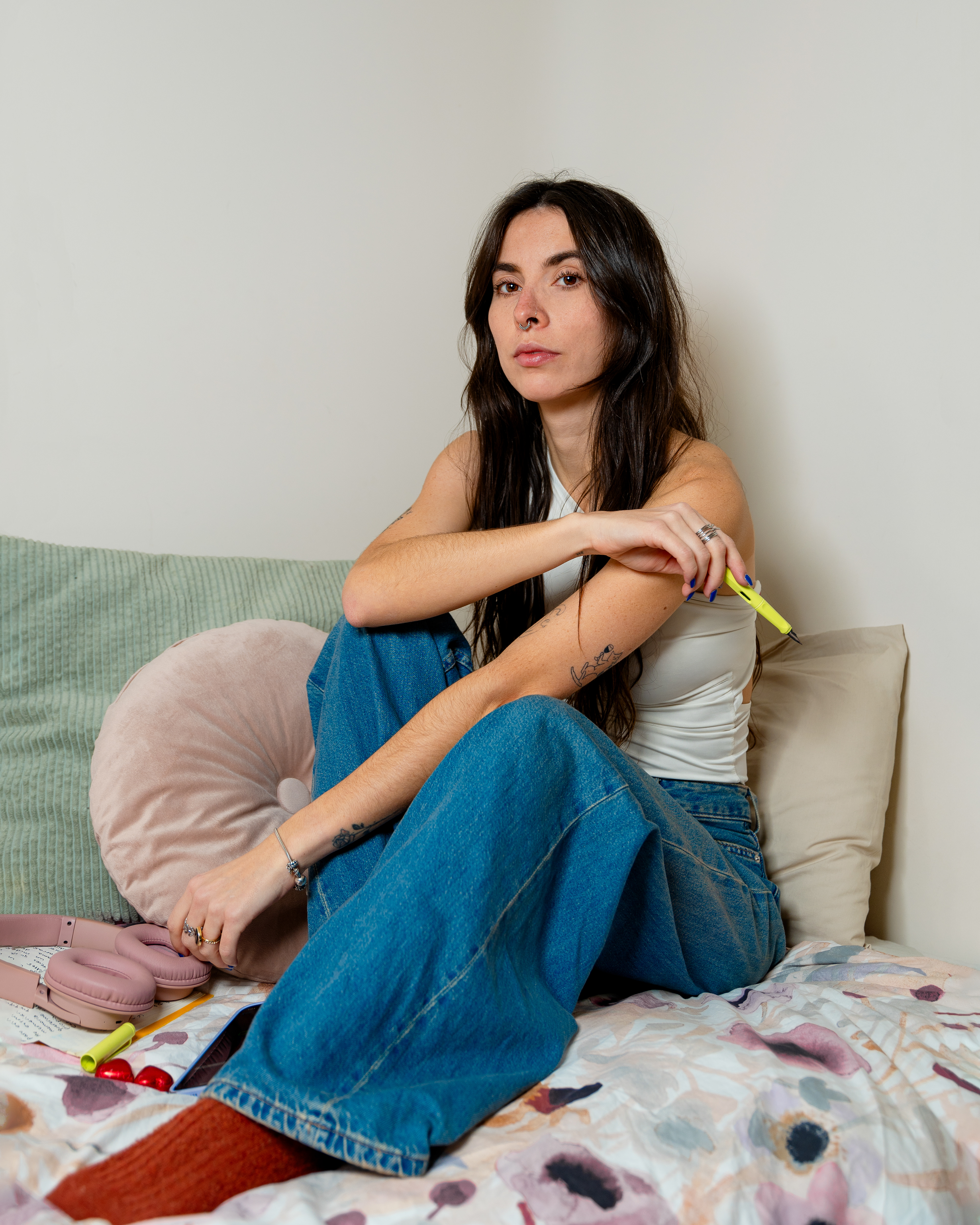 Es una artista interdisciplinaria con una formación y práctica que integran una perspectiva técnica, conceptual y escénica, donde imagen, palabra y cuerpo dialogan de manera estructural. Su trabajo explora las formas en que los cuerpos se relacionan y se inscriben en el espacio íntimo y social. A través de la construcción de imágenes alegóricas y de la escritura poética y narrativa. Investiga tensiones entre cercanía y distancia, deseo y agotamiento, identidad y mandato.